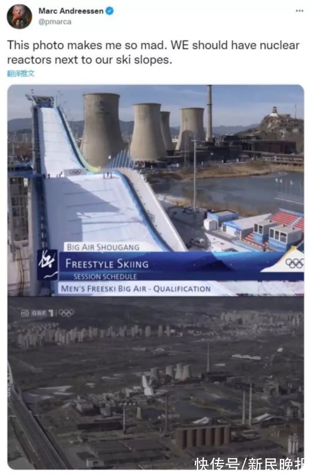美国网景通讯公司创始人马克?安德里森在社交媒体推特上发了首钢大跳台的照片,并配文:“这张照片让我很生气。我们也应该在滑雪场旁边建核反应堆。”